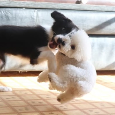 マリーちゃんがおもちちゃんに突進!!宙に浮いている瞬間が撮れました📸この後も、2人仲良く遊んでおりました😆